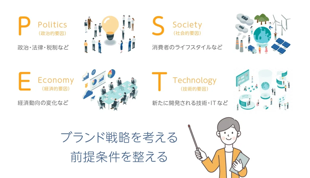政治・経済・社会・技術の4つの視点からマクロ環境(社会を取り巻く大きな外部要因)を整理し、現在および将来的に事業やブランドへどのような影響が考えられるかを読み取るために用いられます。