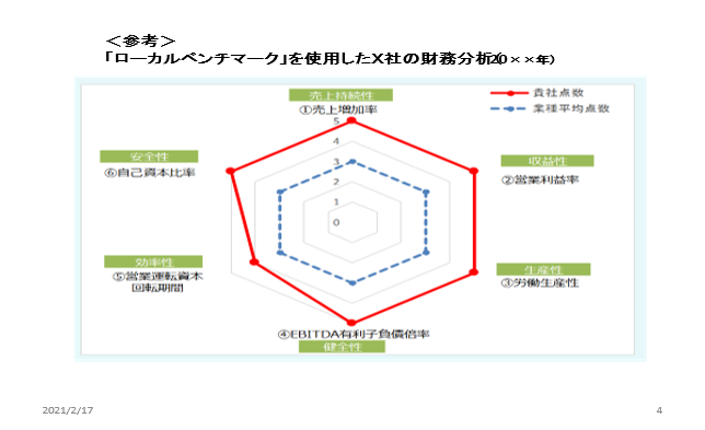ロカベンは、財務面、商流・業務フロー、非財務面の現状把握ができますが、筆者はこのうち特に財務面を自己分析されることをお勧めします。ネットからロカベンシートをダウンロードいただき、所定の項目に決算数字を記入いただくと、6項目の指標についての算出結果、あなたの事業の点数、業界基準値が表示され、同時に次表のようなレーダーチャートによる分析結果が示されます。