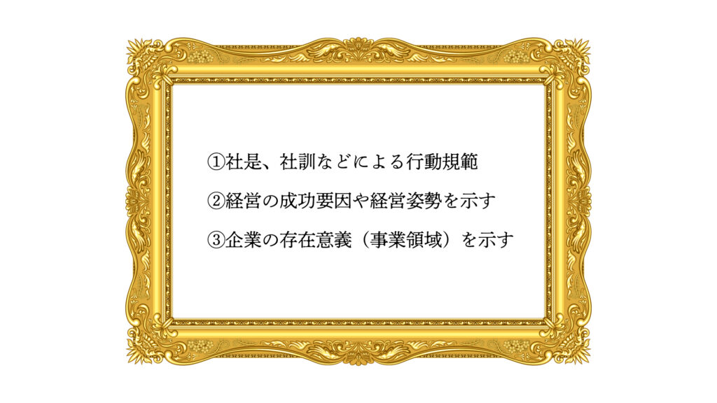 一般に、経営理念は以下のような形あるいは区分で表現されます。