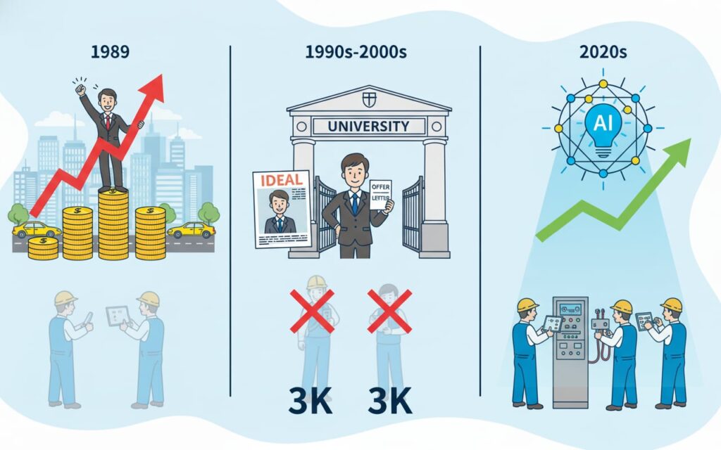 その後の1990〜2000年代には、学歴を重視する風潮がさらに強まり、「いい大学に入り、大企業に入ることが安定した人生」という価値観が社会の主流になりました。テレビや雑誌でもスーツ姿のホワイトカラーの働き方がよく取り上げられ、ブルーカラーの仕事は「きつい・汚い・危険」という意味の“3K”として扱われ、若い人の敬遠が進みました。